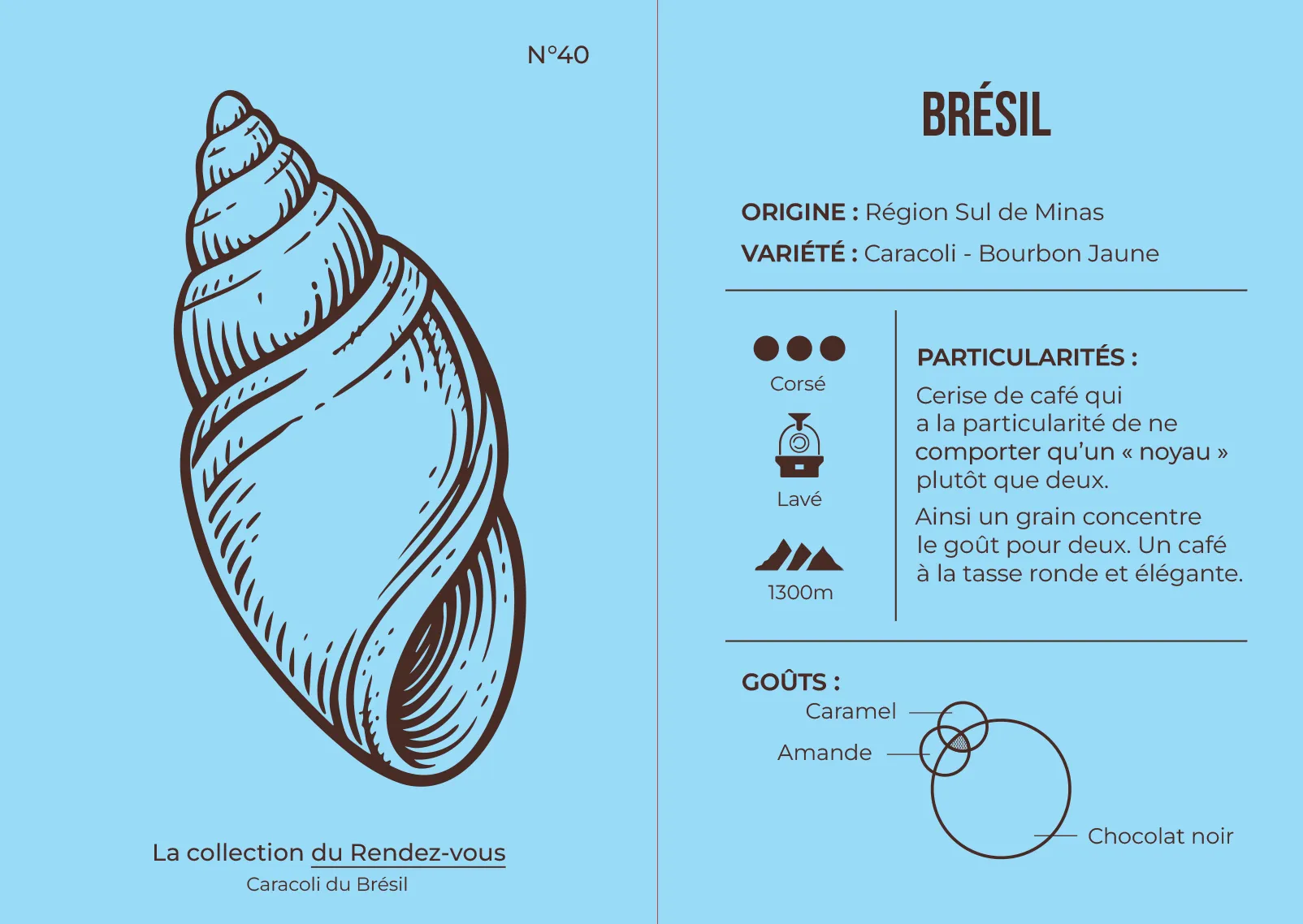 Ce café provient de la région du Sul de Minas, l’un des terroirs les plus réputés du Brésil pour la qualité et la régularité de ses cafés d’altitude. Cultivé à environ 1300 mètres, il bénéficie d’un climat tempéré et de sols favorisant une maturation lente, gage de richesse aromatique et d’équilibre en tasse. Il est issu de la variété Caracoli – Bourbon Jaune, une particularité botanique rare : chaque cerise ne contient qu’un seul grain, au lieu de deux habituellement. Cette singularité permet une concentration accrue des sucres et des arômes, donnant des cafés plus intenses, ronds et expressifs. Préparé selon un process lavé, ce café développe une tasse nette et lisible, tout en conservant une belle ampleur. Le profil aromatique est résolument corsé, porté par un chocolat noir dominant, profond et structurant. En second plan apparaissent des notes de caramel et d’amande, qui apportent douceur et élégance à l’ensemble. La bouche est ronde, harmonieuse, avec une sensation soyeuse et une finale persistante, sans excès d’acidité. Un café généreux mais maîtrisé, idéal pour celles et ceux qui recherchent une tasse gourmande, raffinée et parfaitement équilibrée, aussi bien en espresso qu’en méthodes douces.