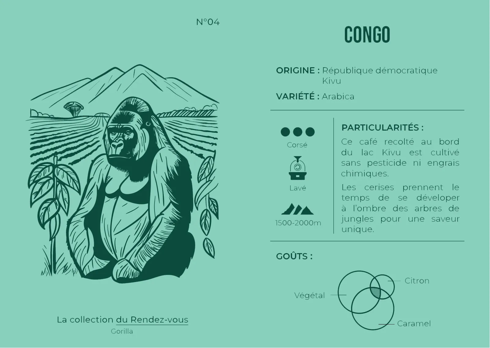 Ce café est produit au sein de la région du Nord-Kivu, dans le parc national des Virunga au bord du lac « Kivu », entre 1500 et 2000 mètres d’altitude. Pour la première année, le café Bonobo est certifié biologique. Cultivées sans pesticide ni engrais chimiques, les cerises prennent le temps de se développer à l’ombre des arbres de jungles. Elles sont ensuite récoltées manuellement par de petits producteurs avant d’être traitées, dépulpées puis triées. Grâce aux conditions climatiques exceptionnelles dont il bénéficie, ce café est considéré comme un « cru unique » pour les amateurs et découvreurs de grands terroirs. Après la récolte, les cerises sont traitées par voie humide puis dépulpées avec des machines traditionnelles. Le café est ensuite acheminé en parche dans la ferme « Kakondo », à 35 km au Nord-Est de Bukavu, puis trié. L’espèce de café cultivée est l’Arabica. Ce café est un blend, c’est-à-dire un assemblage de plusieurs variétés de café. Le processus utilisé pour traiter les grains est le process lavé, qui consiste à éliminer la pulpe des cerises avant de sécher les grains. Le séchage se fait sur des lits de séchage, une méthode traditionnelle qui permet de contrôler l’humidité du café de manière optimale. Le café est cultivé à une altitude de 1800 mètres, offrant des conditions idéales pour un développement aromatique optimal. La période de récolte s’étend de mai à septembre, lorsque les cerises sont à maturité. La récolte est effectuée manuellement, garantissant une sélection rigoureuse des cerises mûres.