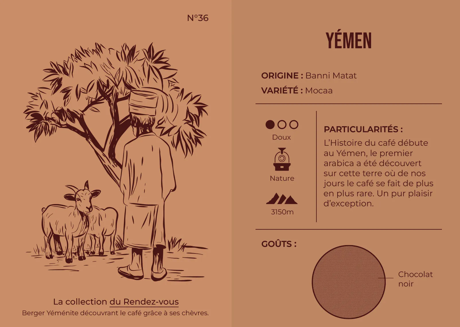 Café Mocca Matari du Yémen, originaire de la région de Bani Mattar à l’ouest de Sana’a. Cultivé entre 3150 et 3300 m, ce café nature aux petites fèves très concentrées offre un profil très parfumé, sauvage et exotique, avec une finale chocolatée.